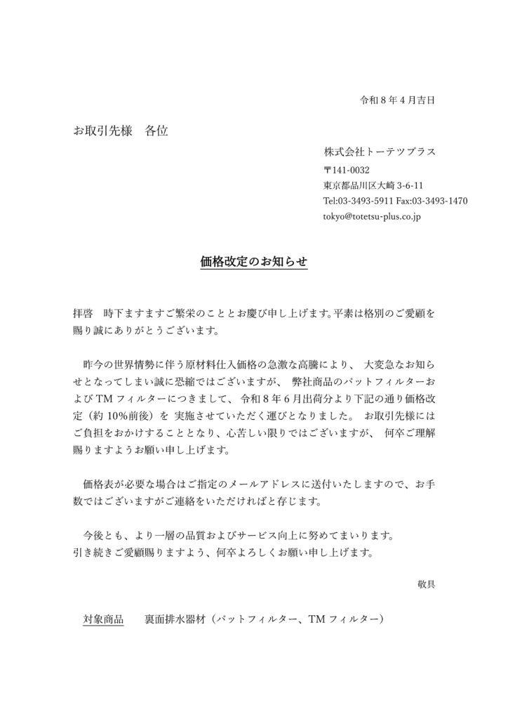 価格改定のお知らせ(パットフィルター・TMフィルター)