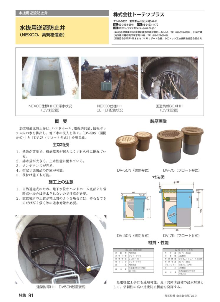 積算資料公表価格版4月号「特集・・・高速道路」掲載【水抜用逆流防止弁DV75/DV50N】